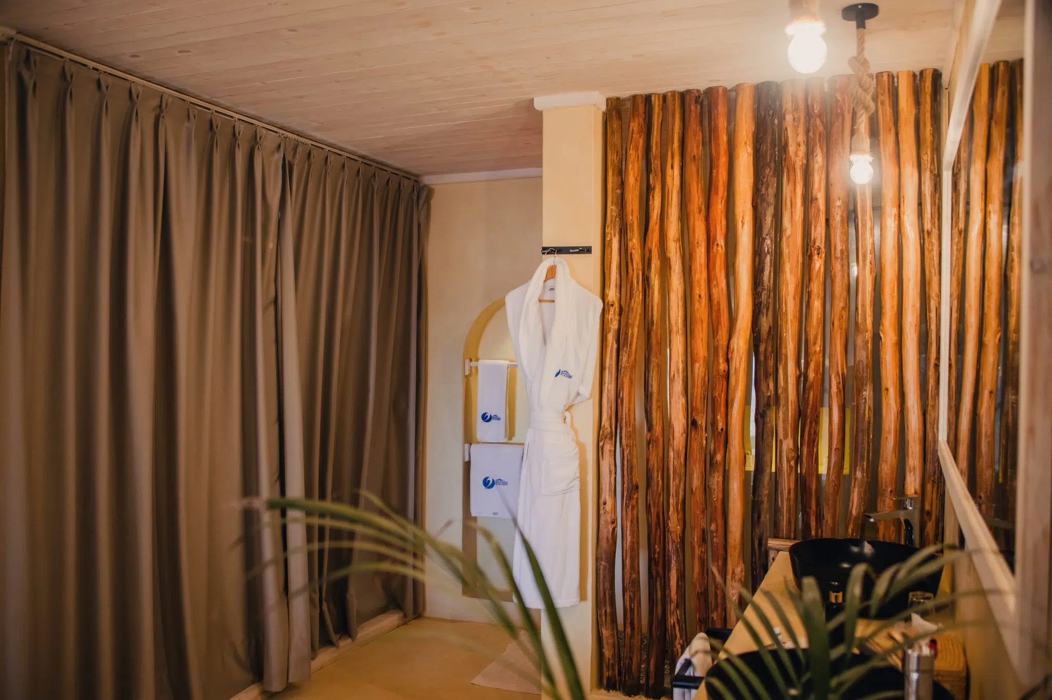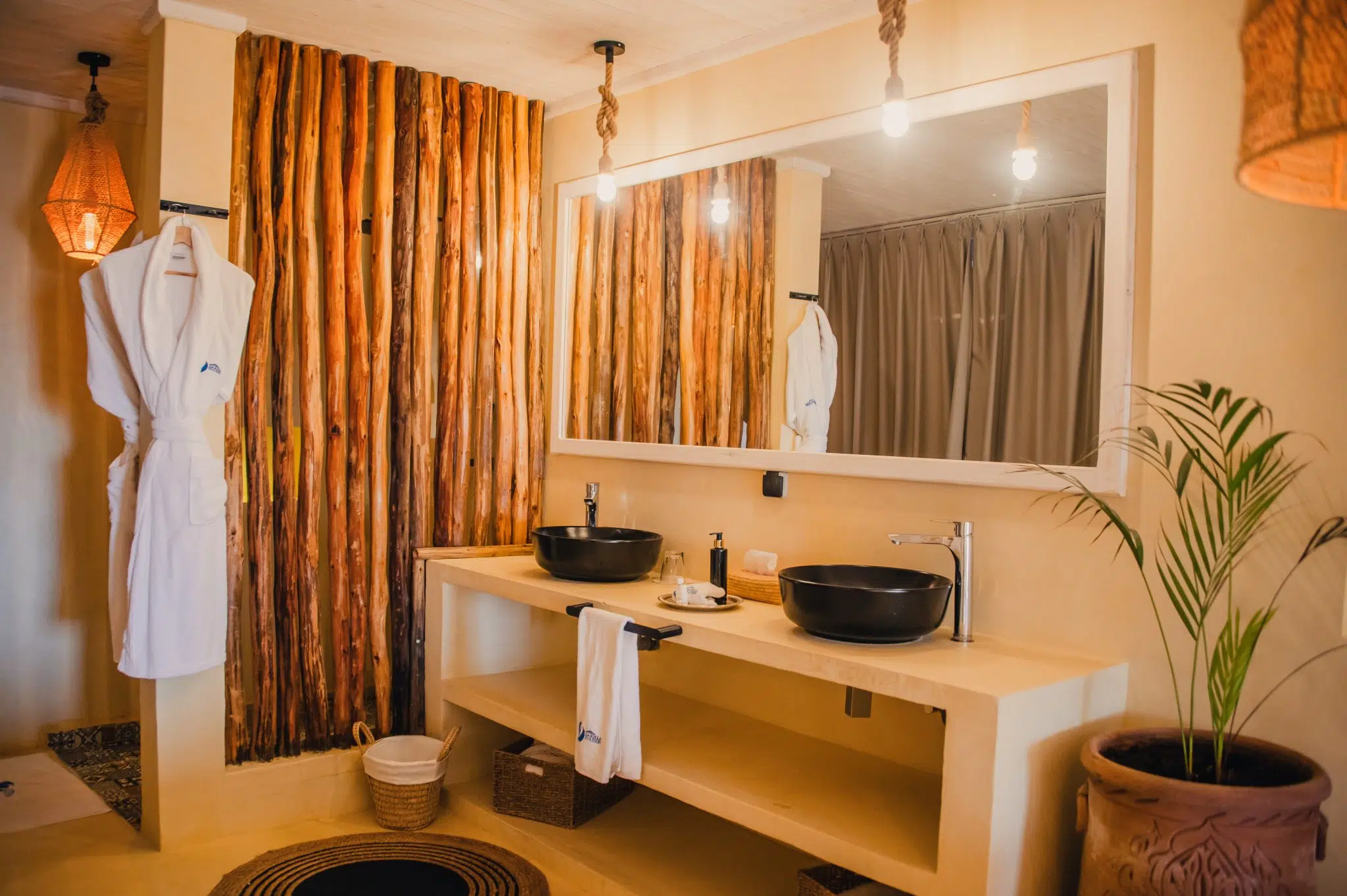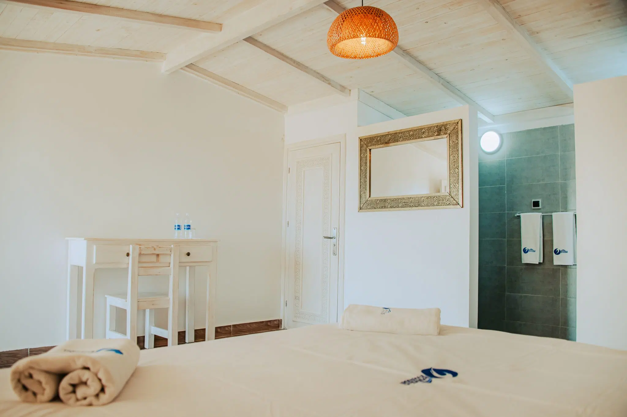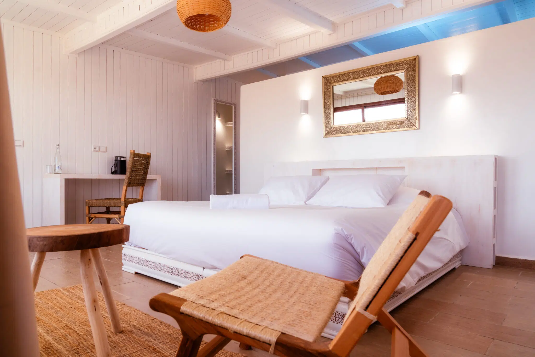 Our 30 square meter chalets have one room, a bathroom, a toilet and a covered terrace. They can accommodate 1 or 2 persons, with the possibility of adding an additional bed for a child. Situated high on the dune, they offer panoramic views of the spot, a veritable jewel of the desert. Residential service is included. Available in the chalets: shower gel and shampoo, bottle of water, bathrobe and towels.